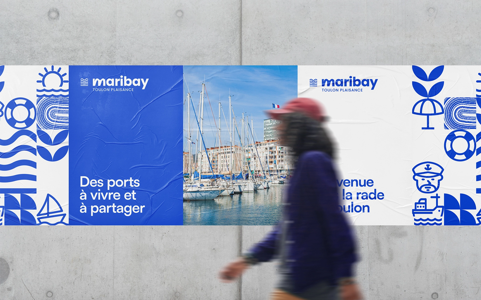 Un système modulable — L'identité visuelle de Maribay doit être bien plus qu'un simple logo. Elle a besoin de complexité, de vie, et de personnalité. En ce sens, nous avons créé une banque d'icônes géométriques, figuratifs et abstraits sous le pavillon du bleu Maribay qui représentent la rade et ses usagers. Les icônes sont conçus sur la base d'une grille permettant de les relier, créant ainsi un réseau continu.