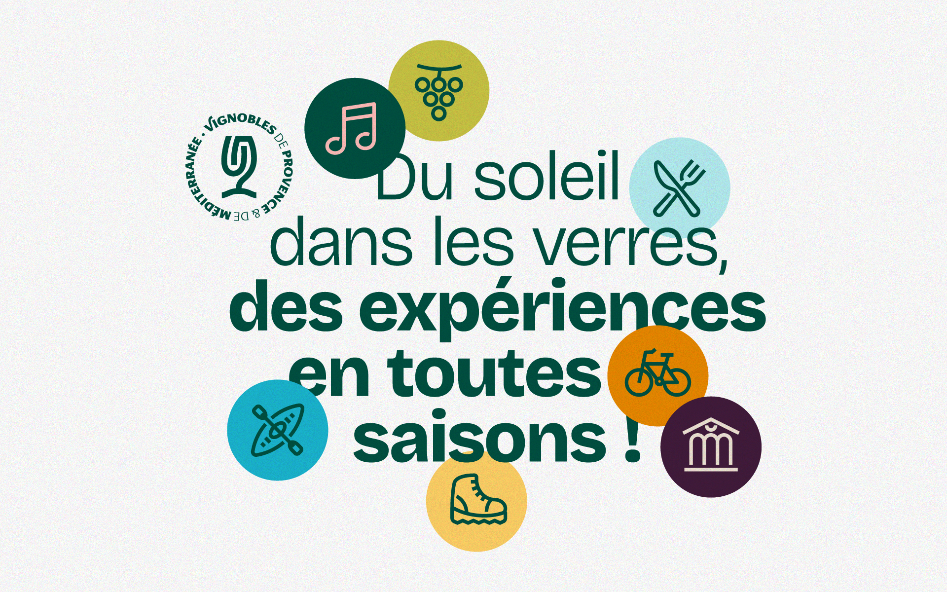 L'identité visuelle pour ce projet, raconte une destination où la mer rencontre les vignes, où la douceur méditerranéenne et l’art du vin se marient. Nous avons conçu en ce sens, l’empreinte des Vignobles de Provence & de Méditerranée, un logotype composé de lignes entrelacées. Il évoque l'union des territoires, les parcours œnotouristiques et l’empreinte humaine des vignobles. Un univers graphique est déployé pour la communication et s'articule autour d'une typographie singulière (Bricolage grotesque dessinée par Mathieu Triay), d'icônes identitaires dessinés sur mesure, et d'une palette de couleurs chaleureuse.